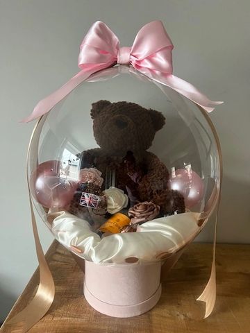 Our Champagne Kisses & Bear Hugs stuffed balloon is the perfect blend of cozy and celebratory. Featuring a cuddly teddy bear paired with champagne (Veuve or Moët), all beautifully arranged inside a crystal-clear balloon and finished with premium details.